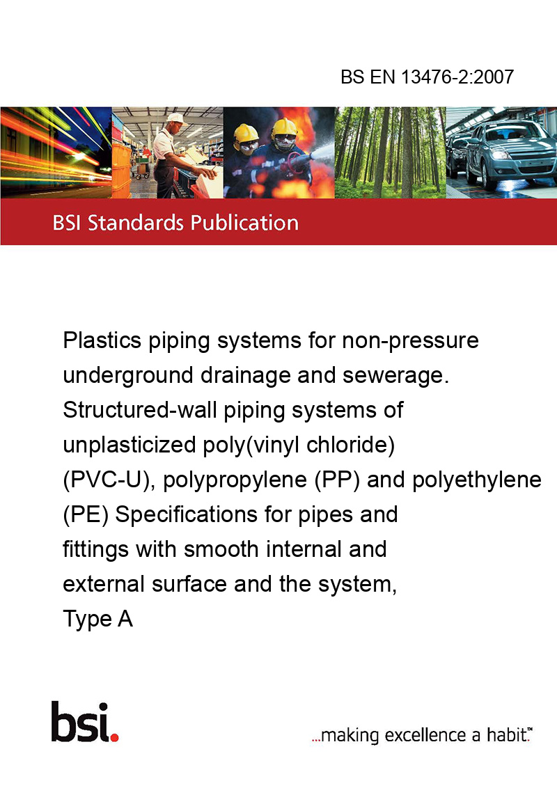 This part of EN 13476, together with EN 13476-1, specifies the definitions and requirements for pipes, fittings and the system based on unplasticized poly(vinyl chloride) (PVC-U), polypropylene (PP) and polyethylene (PE) structured-wall piping systems that are intended to be used for non-pressure underground drainage and sewerage systems. This part is applicable to pipes and fittings with smooth internal and external surfaces, designated as Type A. It specifies test methods and test parameters as well as requirements. This part is applicable to: a) structured-wall pipes and fittings, which are intended to be used buried underground outside the building structure; reflected in the marking of products by “U”; b) structured-wall pipes and fittings, which are intended to be used buried underground both outside (application area code “U”) and within the building structure (application area code “D”); reflected in the marking of products by “UD”. This part is applicable to structured-wall pipes and fittings with or without an integral socket with elastomeric ring seal joints as well as welded and fused joints. This part is intended to be read in conjunction with part 1 of this standard This part covers a range of pipe and fitting sizes, materials, pipe constructions, stiffness classes, application classes, and tolerance classes and gives recommendations concerning colours. NOTE 1 It is the responsibility of the purchaser or specifier to make the appropriate selections from these aspects, taking into account their particular requirements and any relevant national regulations and installation practices or codes. NOTE 2 For dimensions larger than DN 1200 OD/ID this document may be applied regarding appearance, colour, physical and mechanical characteristics as well as performance requirements.