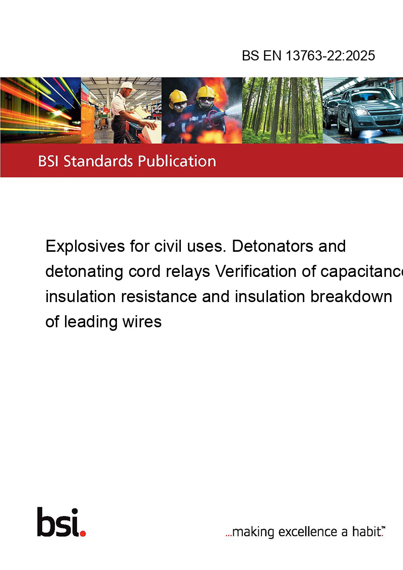 Introducing the BS EN 13763-22:2025, a comprehensive standard that is essential for professionals in the field of civil explosives. This document provides detailed guidelines and verification methods for the capacitance, insulation resistance, and insulation breakdown of leading wires in detonators and detonating cord relays. Released on October 6, 2025, this standard is a critical resource for ensuring safety and efficiency in explosive applications.