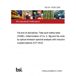 This standard BS EN 14538:2006 Fat and oil derivatives. Fatty acid methyl ester (FAME). Determination of Ca, K, Mg and Na content by optical emission spectral analysis with inductively coupled plasma (ICP OES) is classified in these ICS categories: