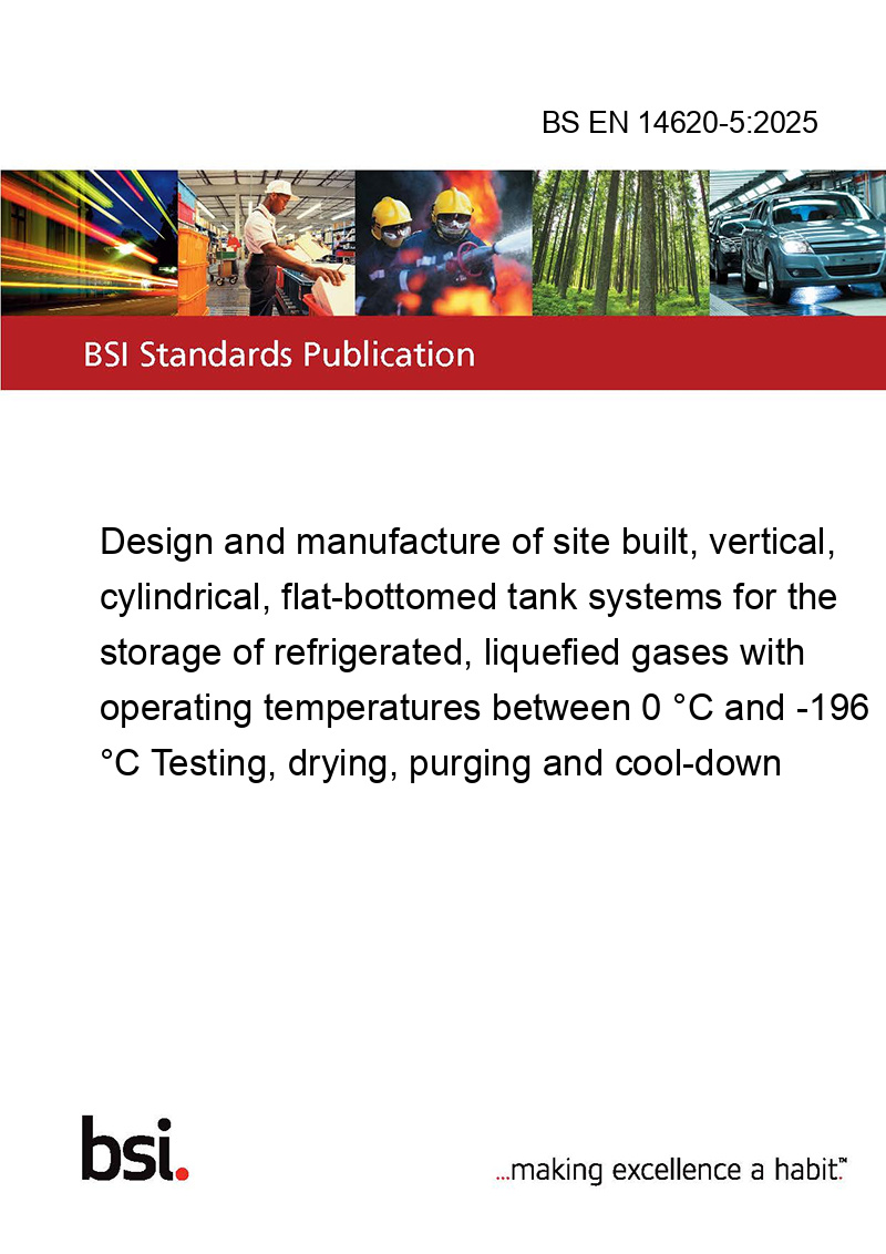 This document is applicable to the design and manufacture of site built, vertical, cylindrical, flat-bottomed tank systems for the storage of refrigerated, liquefied gases with operating temperatures between 0 °C and –196°C. It specifies the requirements for testing, drying, purging, cool-down and decommissioning of refrigerated liquefied gas storage tank systems. The tank systems covered by this document are used to store large volumes of hydrocarbon products, ammonia and other non-hydrocarbon gases with low temperature boiling points, generally called “Refrigerated Liquefied Gases” (RLGs). Typical products stored in the tank systems are: methane, ethane, propane, butane, ethylene, propylene, butadiene (this range includes Liquefied Natural Gas (LNG) and Liquefied Petroleum Gas (LPG), ammonia, nitrogen, oxygen and argon. NOTE Properties of the gases are given in Annex A EN 14620-1:2024. This document provides requirements and specifies measures to be taken following completion of major tank construction activities and before the tank is brought in to service. It provides requirements for full-height and partial height hydrostatic testing to check the structural integrity of tanks and the capacity of the foundations. Settlement monitoring of the foundations at this stage form the starting point of an annual settlement monitoring programme for the tank foundation. Recommendations are given for marker systems for such monitoring. Requirements for water quality of both fresh water and seawater used during hydrotest, are provided to avoid the risk of corrosion of tanks and appurtenances. Guidance and requirements for positive and negative pneumatic tests to further check tank structural integrity, leak tightness of welds and the function of pressure and vacuum relief valve systems are also given. Requirements specific to testing of double wall and membrane type tanks is included. Rules and procedures for commissioning activities, including drying and purging with inert and product gas are provided, including required oxygen concentrations for various RLG’s. The document also provides guidance for cool-down procedures and suggestions for temperature monitoring, including an informative Annex A. For major maintenance inspection or at the end of the life of the tank, decommissioning will be required. Guidance on safe decommissioning processes is provided. Suggested procedures for Global testing for membrane tanks are provided in informative Annex B This document is applicable to the design and manufacture of site built, vertical, cylindrical, flat-bottomed tank systems for the storage of refrigerated, liquefied gases with operating temperatures between 0 °C and -196°C.