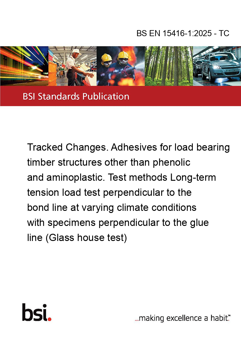 >BSI Standards >83 RUBBER AND PLASTICS INDUSTRIES>83.180 Adhesives>BS EN 15416-1:2025 - TC Tracked Changes. Adhesives for load bearing timber structures other than phenolic and aminoplastic. Test methods Long-term tension load test perpendicular to the bond line at varying climate conditions with specimens perpendicular to the glue line (Glass house test)