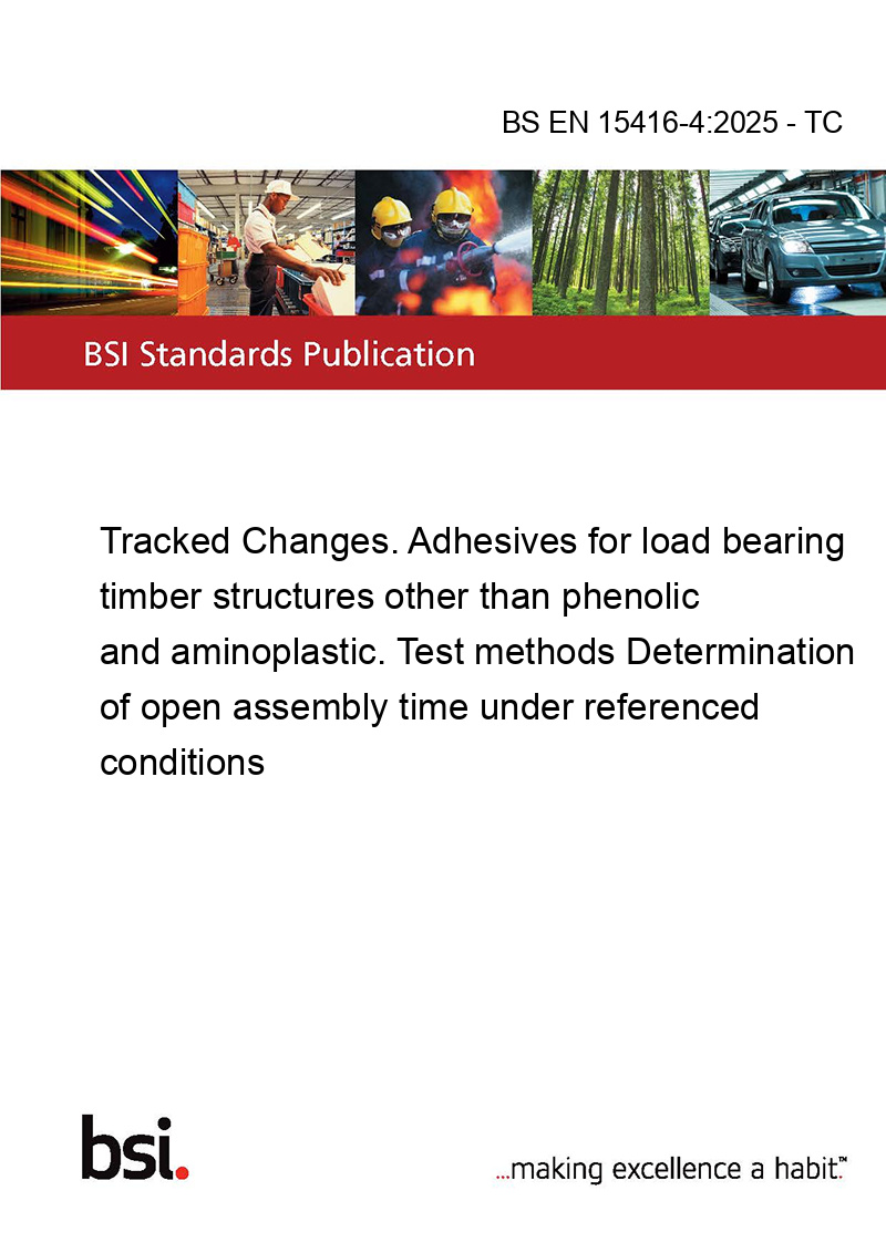 >BSI Standards >83 RUBBER AND PLASTICS INDUSTRIES>83.180 Adhesives>BS EN 15416-4:2025 - TC Tracked Changes. Adhesives for load bearing timber structures other than phenolic and aminoplastic. Test methods Determination of open assembly time under referenced conditions