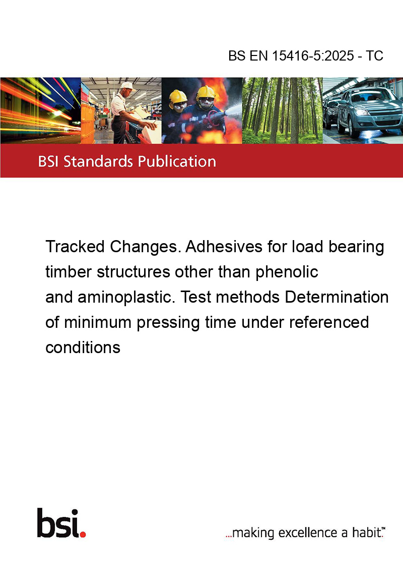 >BSI Standards >83 RUBBER AND PLASTICS INDUSTRIES>83.180 Adhesives>BS EN 15416-5:2025 - TC Tracked Changes. Adhesives for load bearing timber structures other than phenolic and aminoplastic. Test methods Determination of minimum pressing time under referenced conditions