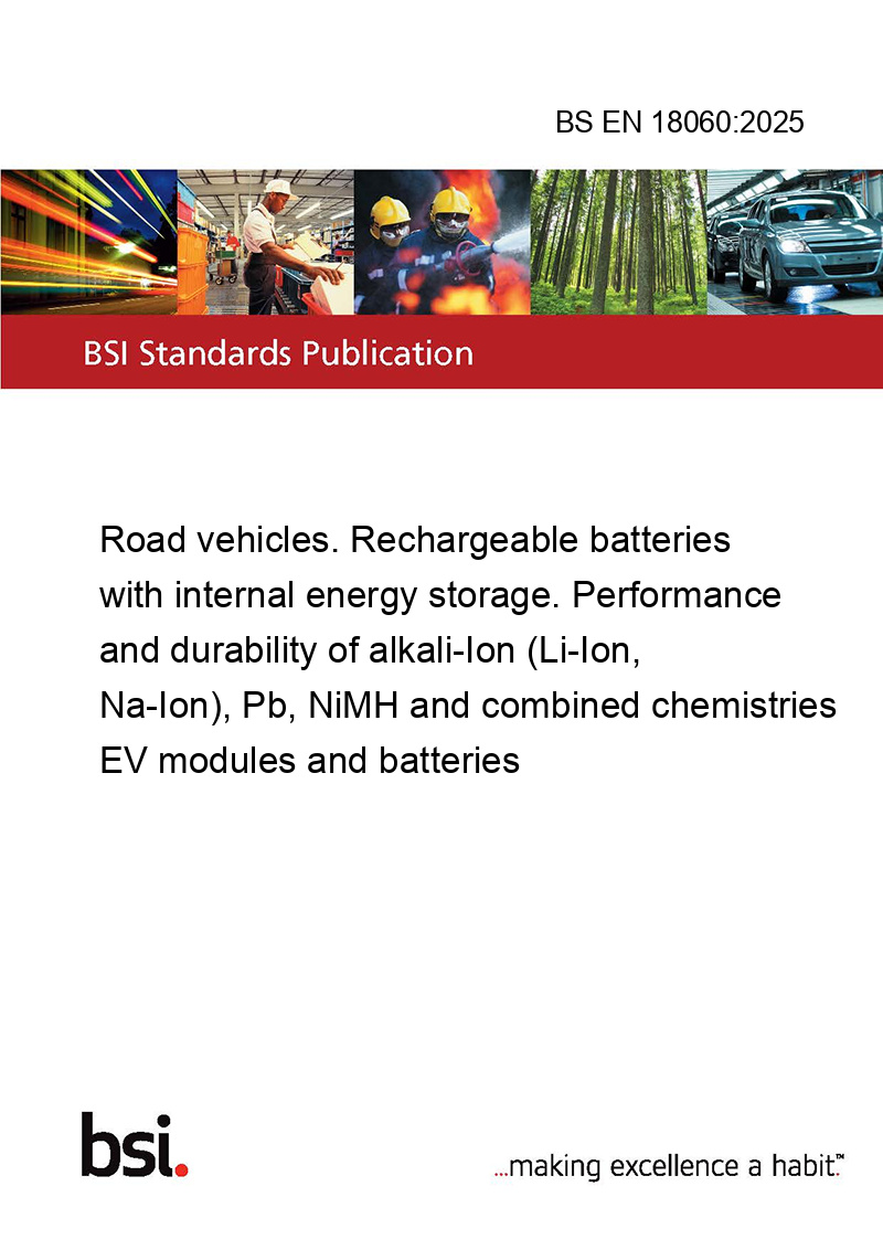 This standard BS EN 18060:2025 Road vehicles. Rechargeable batteries with internal energy storage. Performance and durability of alkali-Ion (Li-Ion, Na-Ion), Pb, NiMH and combined chemistries EV modules and batteries is classified in these ICS categories: