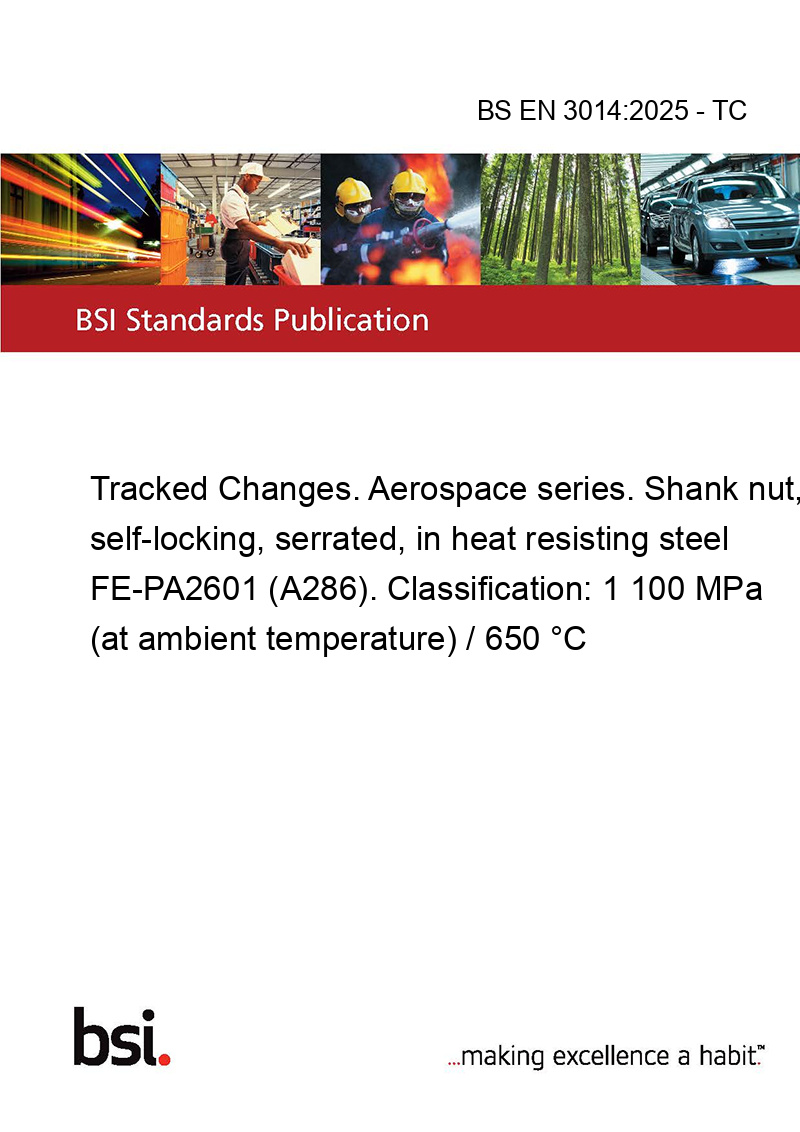 This standard BS EN 3014:2025 - TC Tracked Changes. Aerospace series. Shank nut, self-locking, serrated, in heat resisting steel FE-PA2601 (A286). Classification: 1 100 MPa (at ambient temperature) / 650 °C is classified in these ICS categories: