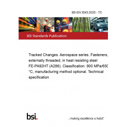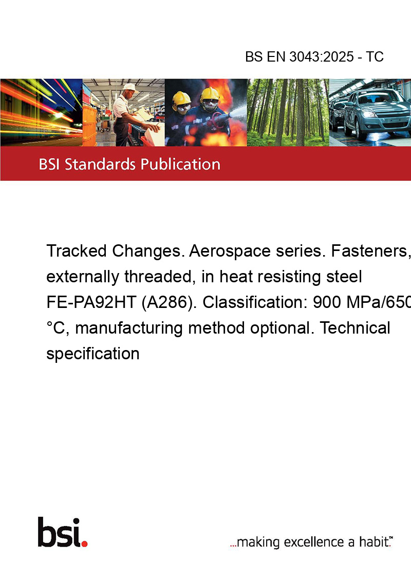 This standard BS EN 3043:2025 - TC Tracked Changes. Aerospace series. Fasteners, externally threaded, in heat resisting steel FE-PA92HT (A286). Classification: 900 MPa/650 °C, manufacturing method optional. Technical specification is classified in these ICS categories: