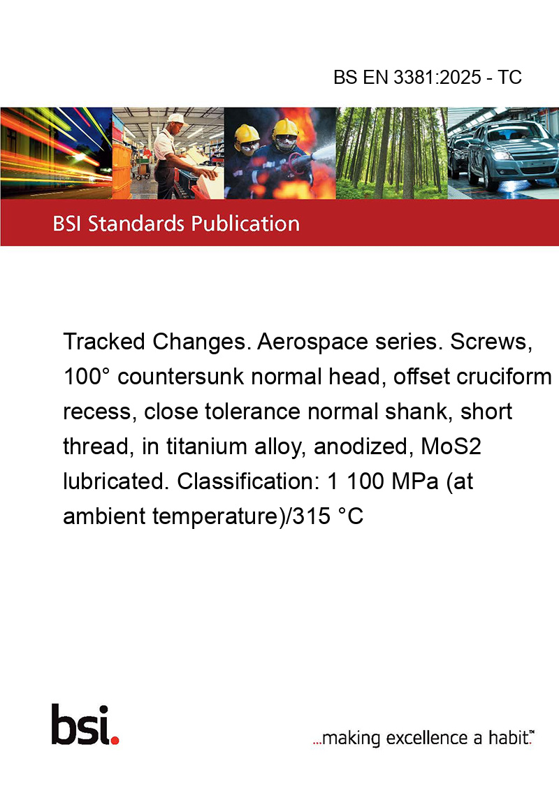 This standard BS EN 3381:2025 - TC Tracked Changes. Aerospace series. Screws, 100° countersunk normal head, offset cruciform recess, close tolerance normal shank, short thread, in titanium alloy, anodized, MoS2 lubricated. Classification: 1 100 MPa (at ambient temperature)/315 °C is classified in these ICS categories: