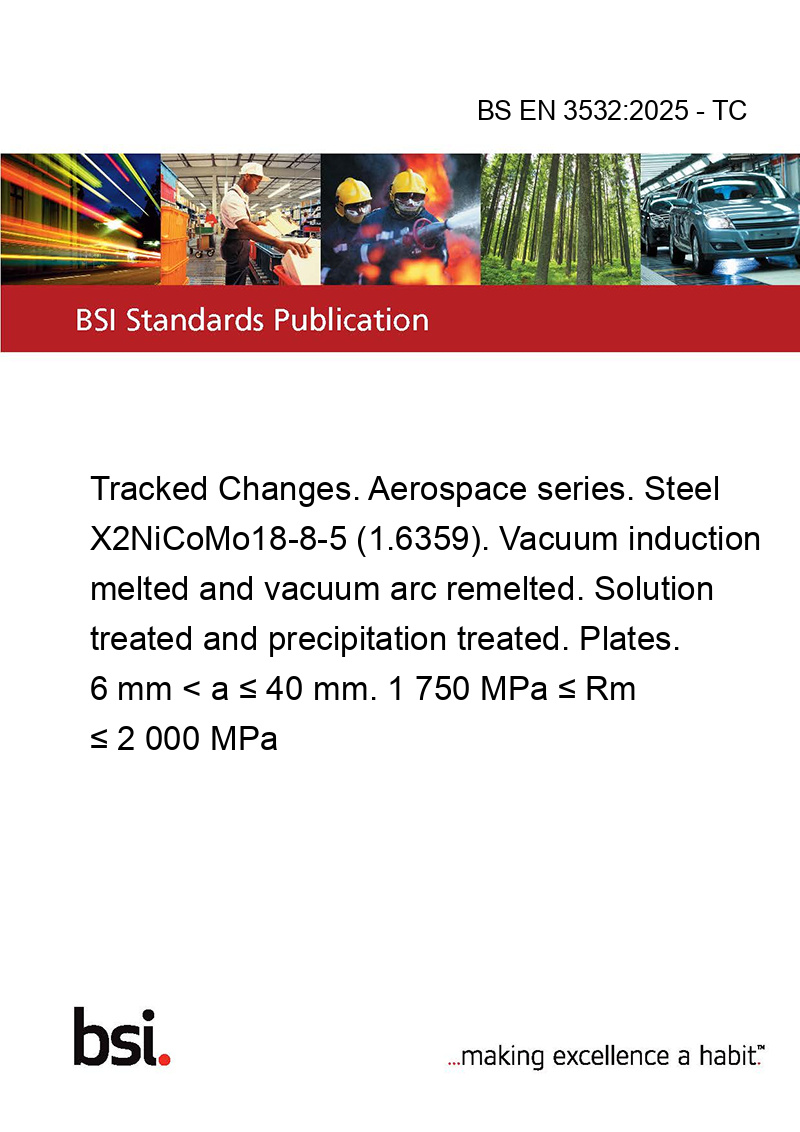 This standard BS EN 3532:2025 - TC Tracked Changes. Aerospace series. Steel X2NiCoMo18-8-5 (1.6359). Vacuum induction melted and vacuum arc remelted. Solution treated and precipitation treated. Plates. 6 mm < a ≤ 40 mm. 1 750 MPa ≤ Rm ≤ 2 000 MPa is classified in these ICS categories: