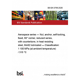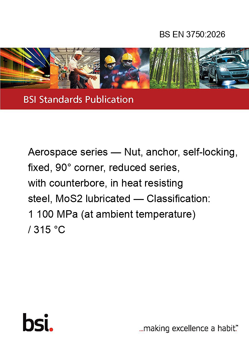 This standard BS EN 3750:2026 Aerospace series — Nut, anchor, self-locking, fixed, 90° corner, reduced series, with counterbore, in heat resisting steel, MoS2 lubricated — Classification: 1 100 MPa (at ambient temperature) / 315 °C is classified in these ICS categories: