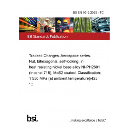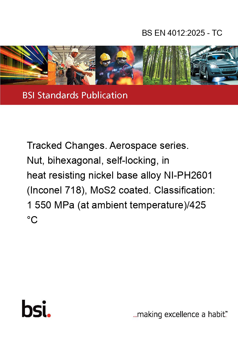 This standard BS EN 4012:2025 - TC Tracked Changes. Aerospace series. Nut, bihexagonal, self-locking, in heat resisting nickel base alloy NI-PH2601 (Inconel 718), MoS2 coated. Classification: 1 550 MPa (at ambient temperature)/425 °C is classified in these ICS categories: