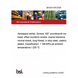 This standard BS EN 4163:2026 Aerospace series. Screws 100° countersunk normal head, offset cruciform recess, coarse tolerance normal shank, long thread, in alloy steel, cadmium plated. Classification: 1 100 MPa (at ambient temperature) / 235 °C is classified in these ICS categories: