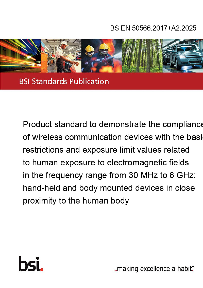 Ensure the safety and compliance of your wireless communication devices with the BS EN 50566:2017+A2:2025 standard. This essential document provides a comprehensive framework to demonstrate compliance with the basic restrictions and exposure limit values related to human exposure to electromagnetic fields (EMF) in the frequency range from 30 MHz to 6 GHz. It specifically addresses hand-held and body-mounted devices in close proximity to the human body, ensuring that your products meet the necessary safety standards.