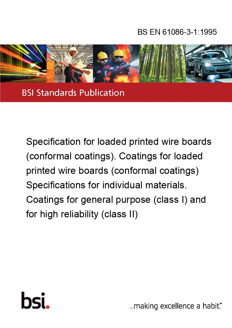 >BSI Standards >31 ELECTRONICS>31.180 Printed circuits and boards>BS EN 61086-3-1:1995 Specification for loaded printed wire boards (conformal coatings). Coatings for loaded printed wire boards (conformal coatings) Specifications for individual materials. Coatings for general purpose (class I) and for high reliability (class II)