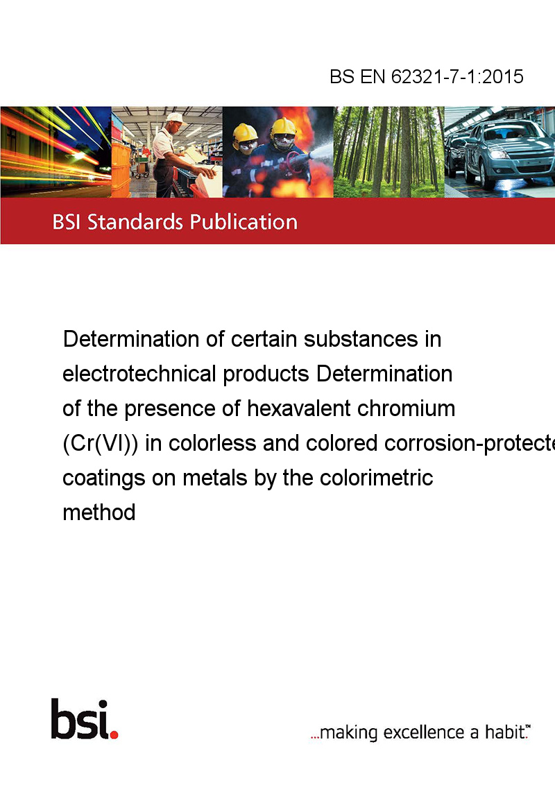 Determination of certain substances in electrotechnical products Determination of the presence of hexavalent chromium (Cr(VI)) in colorless and colored corrosion-protected coatings on metals by the colorimetric method