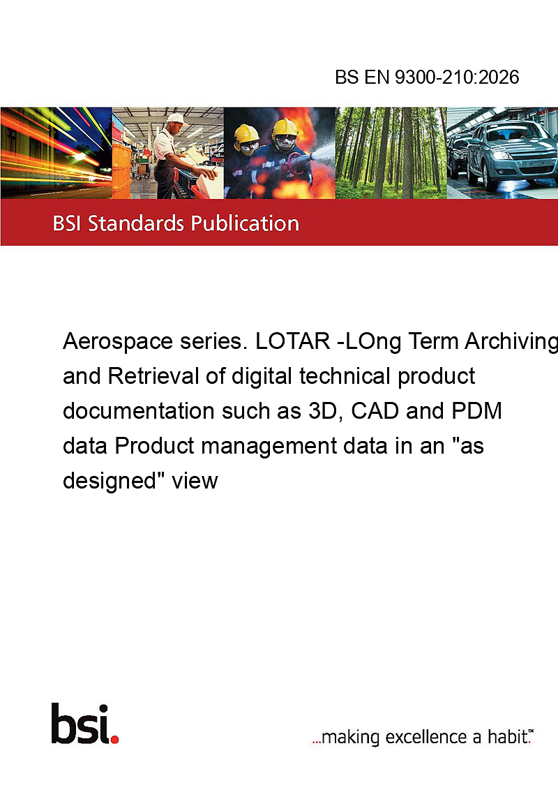 >BSI Standards >01 GENERALITIES. TERMINOLOGY. STANDARDIZATION. DOCUMENTATION>01.110 Technical product documentation>BS EN 9300-210:2026 Aerospace series. LOTAR -LOng Term Archiving and Retrieval of digital technical product documentation such as 3D, CAD and PDM data Product management data in an "as designed" view