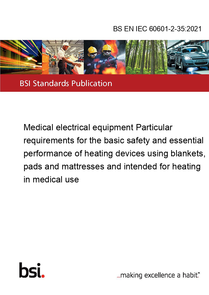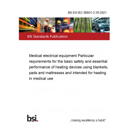 IEC 60601-2-35:2020 applies to the BASIC SAFETY and ESSENTIAL PERFORMANCE of HEATING DEVICES using BLANKETS, PADS or MATTRESSES in medical use, also referred to as ME EQUIPMENT. HEATING DEVICES intended to prewarm a bed are included in the scope of this document. If a clause or subclause is specifically intended to be applicable to ME EQUIPMENT only, or to ME SYSTEMS only, the title and content of that clause or subclause will say so. If that is not the case, the clause or subclause applies both to ME EQUIPMENT and to ME SYSTEMS, as relevant. If a clause or subclause is specifically intended to be applicable to a specifically defined type of ME EQUIPMENT, as is the case with FORCED AIR DEVICES, then the title and content of that clause or subclause will say so. If that is not the case, the clause or subclause applies both to ME EQUIPMENT and to ME SYSTEMS, as relevant. HAZARDS inherent in the intended physiological function of ME EQUIPMENT or ME SYSTEMS within the scope of this document are not covered by specific requirements in this document, except in 7.2.13 and 8.4.1 of the general standard. IEC 60601-2-35:2020 does not apply to: - HEATING DEVICES intended for physiotherapy; - INFANT RADIANT WARMERS; for information, see IEC 60601-2-21; - INFANT INCUBATORS; for information, see IEC 60601-2-19; - INFANT TRANSPORT INCUBATORS, for information, see IEC 60601-2-20; - cooling devices. IEC 60601-2-35:2020 cancels and replaces IEC 80601-2-35 published in 2009 and Amendment 1:2016. This edition constitutes a technical revision. IEC 60601-2-35:2020 includes the following significant technical change with respect to the previous edition: re-dating of normative references.