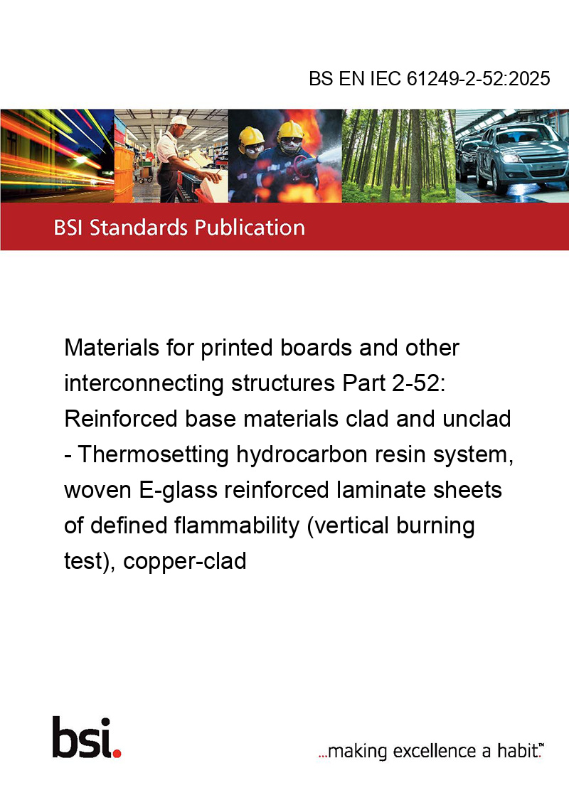 IEC 61249-2-52:2025 gives requirements for properties of the thermosetting hydrocarbon resin system, woven E-glass reinforced laminate sheets of defined flammability (vertical burning test), copper-clad in thicknesses of 0,05 mm up to 3,20 mm.