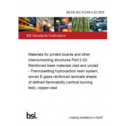 >BSI Standards >31 ELECTRONICS>31.180 Printed circuits and boards>BS EN IEC 61249-2-52:2025 Materials for printed boards and other interconnecting structures Part 2-52: Reinforced base materials clad and unclad - Thermosetting hydrocarbon resin system, woven E-glass reinforced laminate sheets of defined flammability (vertical burning test), copper-clad
