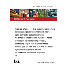 IEC 63267-3-61: 2025 defines the dimensional limits of an optical interface for reference connectors with 2,5 mm or 1,25 mm diameter cylindrical zirconia (ZrO2) ferrules necessary to meet specific requirements for fibre-to-fibre interconnection of non-angled polished multimode reference connections as defined in IEC 63267-2-2. Ferrule dimensions and features are contained in the IEC 61754 series of fibre optic connector interface standards. One grade of reference connector, Rm1, is defined in this document. The reference connector is terminated to restricted IEC 60793-2-10 using A1-OM2b to A1‑OM5b fibre in 850 nm band only. The geometrical dimensions and tolerances of the specified reference connector have been developed primarily to limit the variation in measured attenuation between multiple sets of reference connectors, and therefore to reduce the variation in measured attenuation between an arbitrarily chosen reference connector when mated with a connector in the field or factory. This first edition and the first edition of IEC 63267-2-2 cancel and replace the first edition of IEC 61755-6-2 published in 2018. This edition constitutes a technical revision. The document includes the following significant technical changes with respect to the previous edition: a) Definition of a reference grade, Rm1 interface; b) Inclusion of A1-OM2b to A1-OM5b fibres; c) Updates to normative references; d) The addition of Annex A, which describes the attenuation test limits of reference grade Rm1 connectors to grade Bm connectors; e) A new Annex B that describes the allowable fibre undercut.