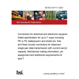 Introducing the BS IEC 63171-7:2023, a comprehensive standard for connectors for electrical and electronic equipment. This detailed specification covers up to 7 ways including PE or FE (data/power) and shield pin, free and fixed circular connectors for balanced single-pair data transmission with current-carrying capacity. It also provides mechanical mating information, pin assignment, and additional requirements for type 7.