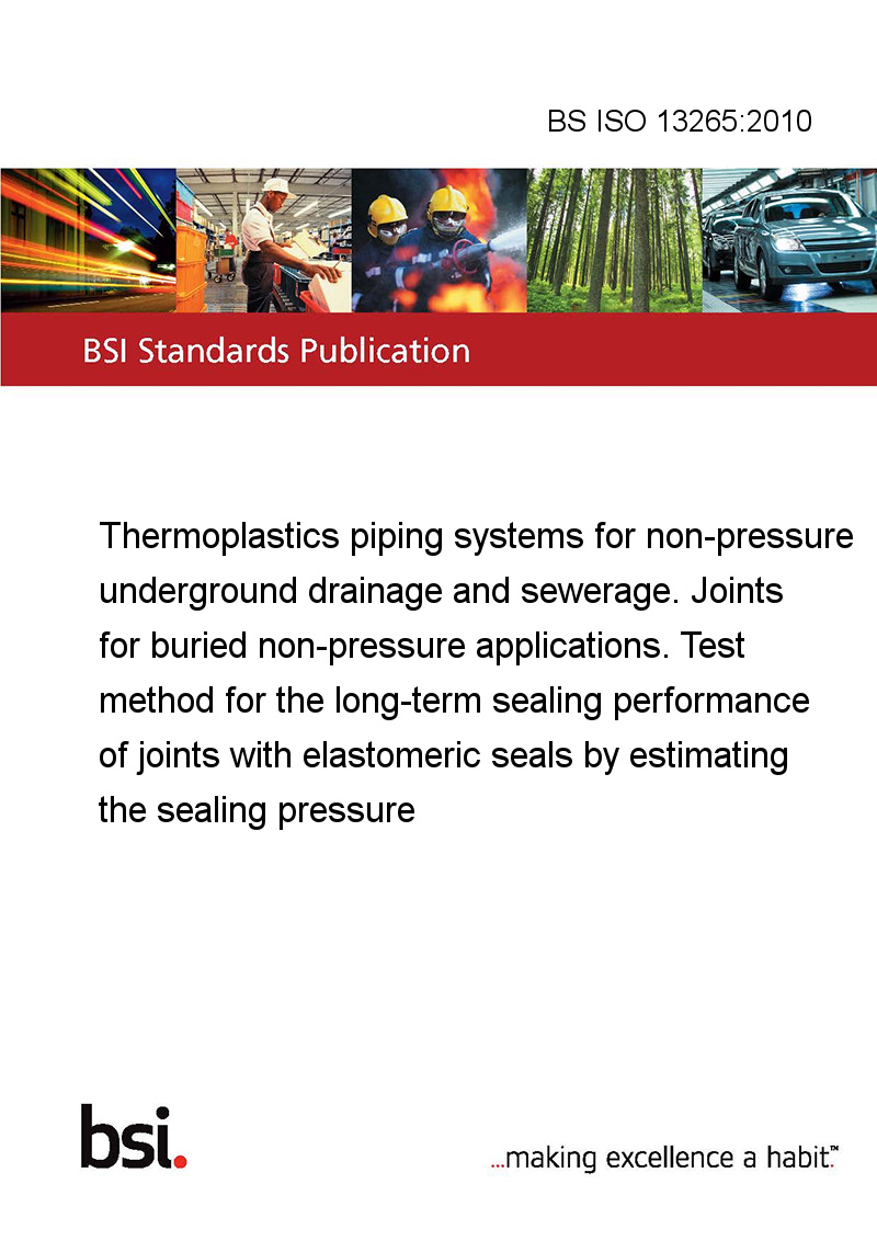 This standard BS ISO 13265:2010 Thermoplastics piping systems for non-pressure underground drainage and sewerage. Joints for buried non-pressure applications. Test method for the long-term sealing performance of joints with elastomeric seals by estimating the sealing pressure is classified in these ICS categories: