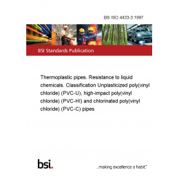 The method of classification given in this part of ISO 4433 serves to determine the chemical resistance of unplasticized poly(vinyl chloride) (PVC-U), high-impact poly(vinyl chloride) (PVC-HI) and chlorinated poly(vinyl chloride) (PVC-C) pipes designed for the conveyance of liquids in the absence of pressure and stress (e.g. due to earth loads or traffic loads, dynamic or internal stresses).