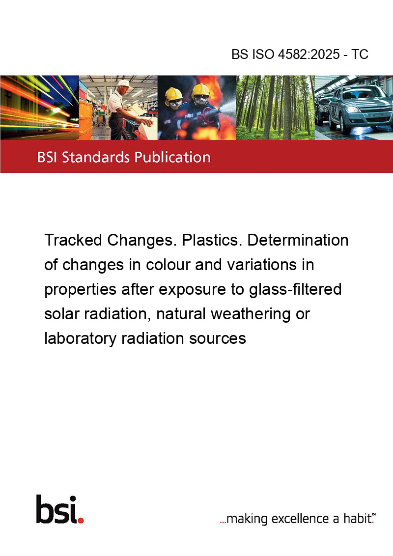 This standard BS ISO 4582:2025 - TC Tracked Changes. Plastics. Determination of changes in colour and variations in properties after exposure to glass-filtered solar radiation, natural weathering or laboratory radiation sources is classified in these ICS categories: