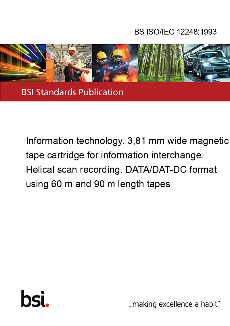 This standard BS ISO/IEC 12248:1993 Information technology. 3,81 mm wide magnetic tape cartridge for information interchange. Helical scan recording. DATA/DAT-DC format using 60 m and 90 m length tapes is classified in these ICS categories:
