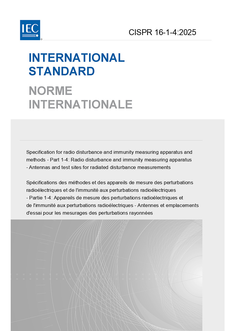 CISPR 16-1-4:2025 specifies the characteristics and performance of equipment for the measurement of radiated disturbances in the frequency range 9 kHz to 18 GHz. Specifications for antennas and test sites are included.