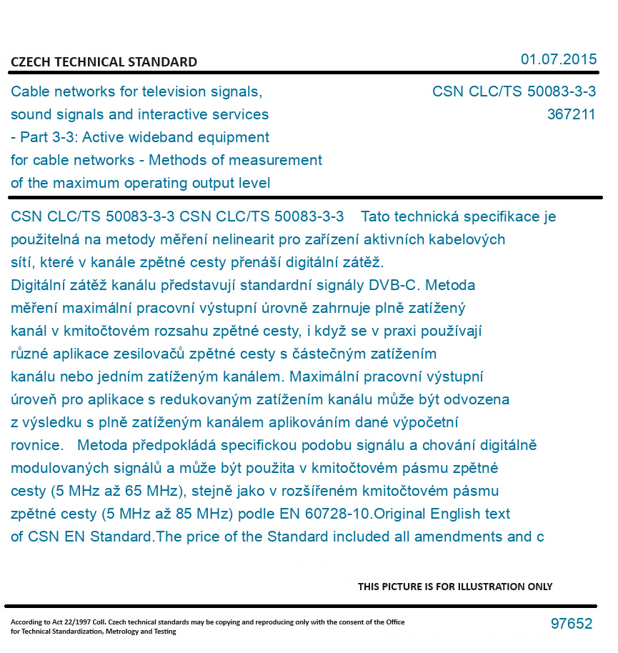 CSN CLC/TS 50083-3-3 Tato technická specifikace je použitelná na metody měření nelinearit pro zařízení aktivních kabelových sítí, které v kanále zpětné cesty přenáší digitální zátěž. Digitální zátěž kanálu představují standardní signály DVB-C. Metoda měření maximální pracovní výstupní úrovně zahrnuje plně zatížený kanál v kmitočtovém rozsahu zpětné cesty, i když se v praxi používají různé aplikace zesilovačů zpětné cesty s částečným zatížením kanálu nebo jedním zatíženým kanálem. Maximální pracovní výstupní úroveň pro aplikace s redukovaným zatížením kanálu může být odvozena z výsledku s plně zatíženým kanálem aplikováním dané výpočetní rovnice. Metoda předpokládá specifickou podobu signálu a chování digitálně modulovaných signálů a může být použita v kmitočtovém pásmu zpětné cesty (5 MHz až 65 MHz), stejně jako v rozšířeném kmitočtovém pásmu zpětné cesty (5 MHz až 85 MHz) podle EN 60728-10. Original English text of CSN EN Standard. The price of the Standard included all amendments and correcturs.