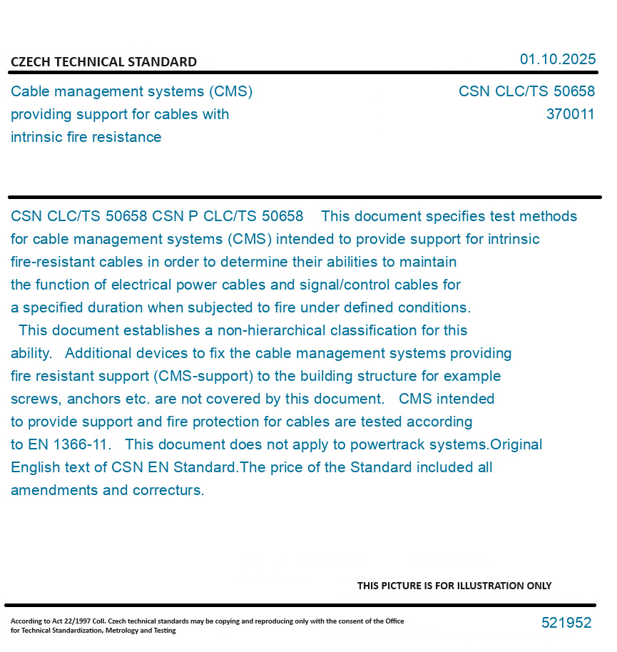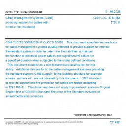 CSN P CLC/TS 50658 This document specifies test methods for cable management systems (CMS) intended to provide support for intrinsic fire-resistant cables in order to determine their abilities to maintain the function of electrical power cables and signal/control cables for a specified duration when subjected to fire under defined conditions. This document establishes a non-hierarchical classification for this ability. Additional devices to fix the cable management systems providing fire resistant support (CMS-support) to the building structure for example screws, anchors etc. are not covered by this document. CMS intended to provide support and fire protection for cables are tested according to EN 1366-11. This document does not apply to powertrack systems. Original English text of CSN EN Standard. The price of the Standard included all amendments and correcturs.