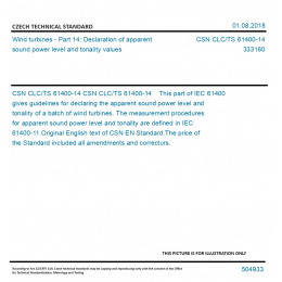 CSN CLC/TS 61400-14 This part of IEC 61400 gives guidelines for declaring the apparent sound power level and tonality of a batch of wind turbines. The measurement procedures for apparent sound power level and tonality are defined in IEC 61400-11. Original English text of CSN EN Standard. The price of the Standard included all amendments and correcturs.