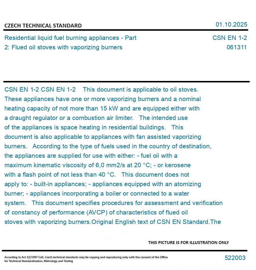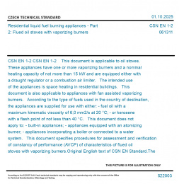 CSN EN 1-2 This document is applicable to oil stoves. These appliances have one or more vaporizing burners and a nominal heating capacity of not more than 15 kW and are equipped either with a draught regulator or a combustion air limiter. The intended use of the appliances is space heating in residential buildings. This document is also applicable to appliances with fan assisted vaporizing burners. According to the type of fuels used in the country of destination, the appliances are supplied for use with either: - fuel oil with a maximum kinematic viscosity of 6,0 mm2/s at 20 °C; - or kerosene with a flash point of not less than 40 °C. This document does not apply to: - built-in appliances; - appliances equipped with an atomizing burner; - appliances incorporating a boiler or connected to a water system. This document specifies procedures for assessment and verification of constancy of performance (AVCP) of characteristics of flued oil stoves with vaporizing burners. Original English text of CSN EN Standard. The price of the Standard included all amendments and correcturs.