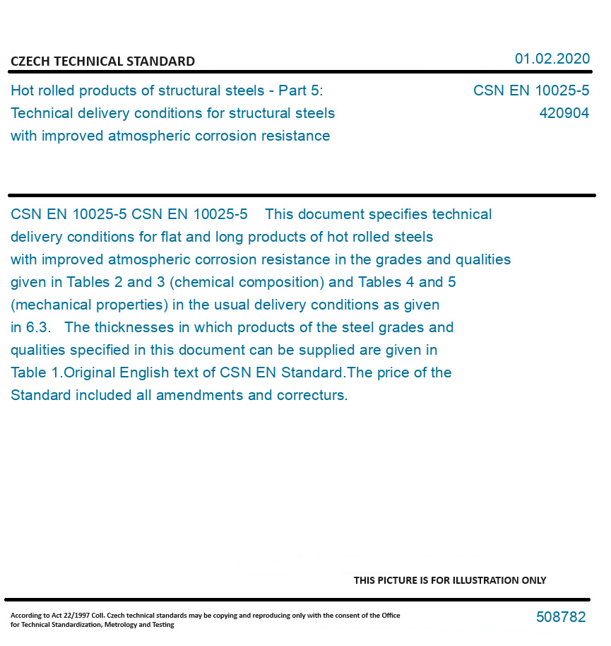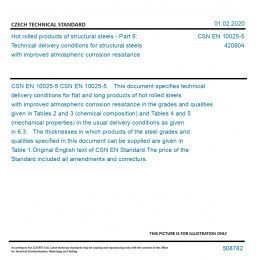 CSN EN 10025-5 This document specifies technical delivery conditions for flat and long products of hot rolled steels with improved atmospheric corrosion resistance in the grades and qualities given in Tables 2 and 3 (chemical composition) and Tables 4 and 5 (mechanical properties) in the usual delivery conditions as given in 6.3. The thicknesses in which products of the steel grades and qualities specified in this document can be supplied are given in Table 1. Original English text of CSN EN Standard. The price of the Standard included all amendments and correcturs.
