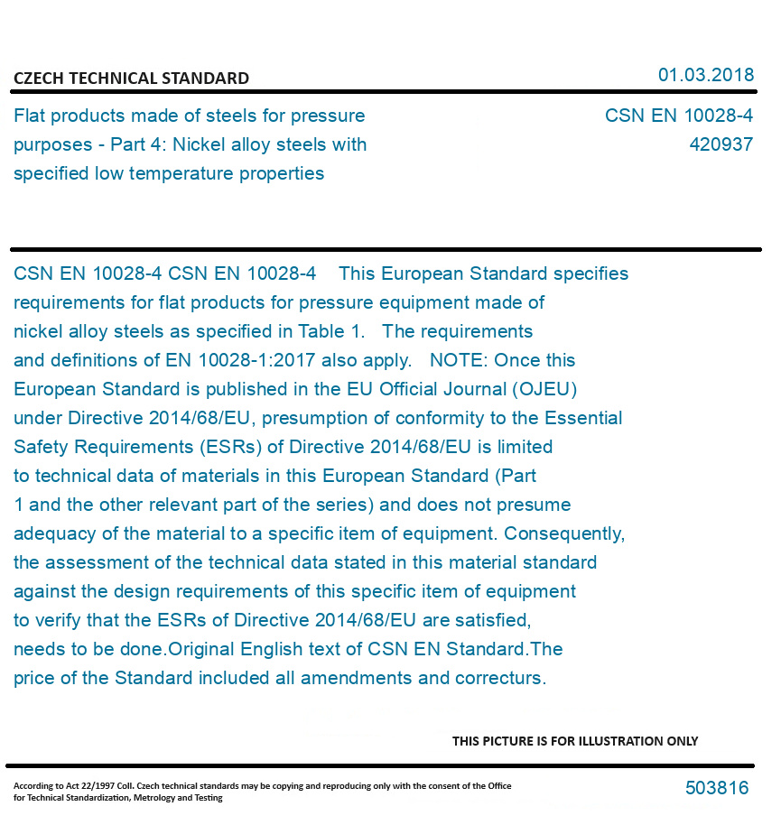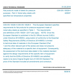 CSN EN 10028-4 This European Standard specifies requirements for flat products for pressure equipment made of nickel alloy steels as specified in Table 1. The requirements and definitions of EN 10028-1:2017 also apply. NOTE: Once this European Standard is published in the EU Official Journal (OJEU) under Directive 2014/68/EU, presumption of conformity to the Essential Safety Requirements (ESRs) of Directive 2014/68/EU is limited to technical data of materials in this European Standard (Part 1 and the other relevant part of the series) and does not presume adequacy of the material to a specific item of equipment. Consequently, the assessment of the technical data stated in this material standard against the design requirements of this specific item of equipment to verify that the ESRs of Directive 2014/68/EU are satisfied, needs to be done. Original English text of CSN EN Standard. The price of the Standard included all amendments and correcturs.