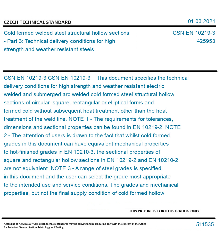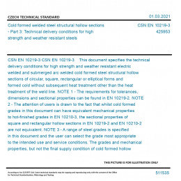 CSN EN 10219-3 This document specifies the technical delivery conditions for high strength and weather resistant electric welded and submerged arc welded cold formed steel structural hollow sections of circular, square, rectangular or elliptical forms and formed cold without subsequent heat treatment other than the heat treatment of the weld line. NOTE 1 - The requirements for tolerances, dimensions and sectional properties can be found in EN 10219-2. NOTE 2 - The attention of users is drawn to the fact that whilst cold formed grades in this document can have equivalent mechanical properties to hot-finished grades in EN 10210-3, the sectional properties of square and rectangular hollow sections in EN 10219-2 and EN 10210-2 are not equivalent. NOTE 3 - A range of steel grades is specified in this document and the user can select the grade most appropriate to the intended use and service conditions. The grades and mechanical properties, but not the final supply condition of cold formed hollow sections are generally comparable with those in EN 10025-3, EN 10025-4, EN 10025-5, EN 10025-6, EN 10149-2 and EN 10149-3. Original English text of CSN EN Standard. The price of the Standard included all amendments and correcturs.
