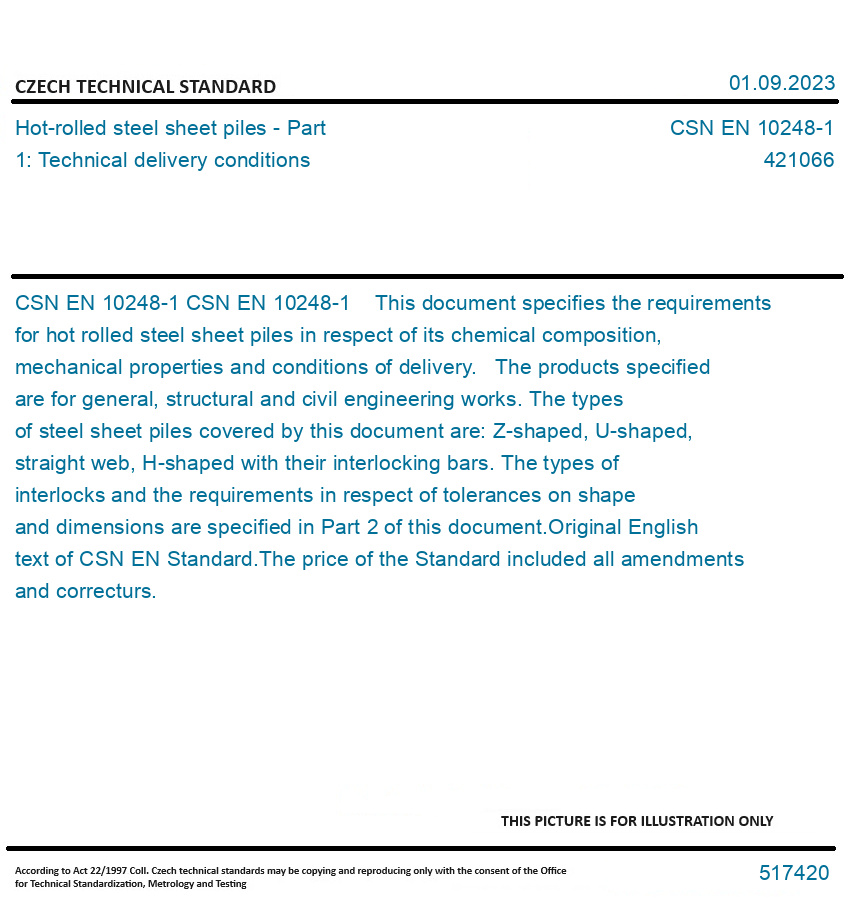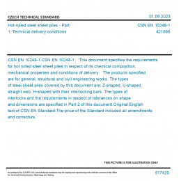CSN EN 10248-1 This document specifies the requirements for hot rolled steel sheet piles in respect of its chemical composition, mechanical properties and conditions of delivery. The products specified are for general, structural and civil engineering works. The types of steel sheet piles covered by this document are: Z-shaped, U-shaped, straight web, H-shaped with their interlocking bars. The types of interlocks and the requirements in respect of tolerances on shape and dimensions are specified in Part 2 of this document. Original English text of CSN EN Standard. The price of the Standard included all amendments and correcturs.