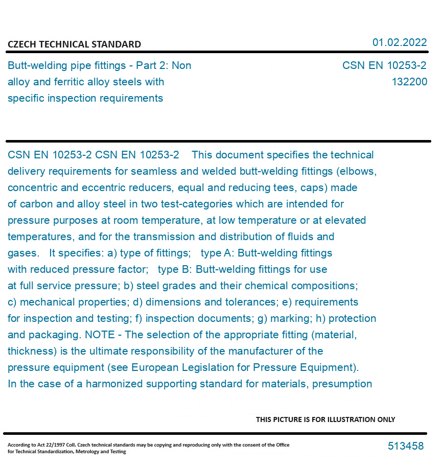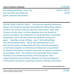 CSN EN 10253-2 This document specifies the technical delivery requirements for seamless and welded butt-welding fittings (elbows, concentric and eccentric reducers, equal and reducing tees, caps) made of carbon and alloy steel in two test-categories which are intended for pressure purposes at room temperature, at low temperature or at elevated temperatures, and for the transmission and distribution of fluids and gases. It specifies: a) type of fittings; type A: Butt-welding fittings with reduced pressure factor; type B: Butt-welding fittings for use at full service pressure; b) steel grades and their chemical compositions; c) mechanical properties; d) dimensions and tolerances; e) requirements for inspection and testing; f) inspection documents; g) marking; h) protection and packaging. NOTE - The selection of the appropriate fitting (material, thickness) is the ultimate responsibility of the manufacturer of the pressure equipment (see European Legislation for Pressure Equipment). In the case of a harmonized supporting standard for materials, presumption of conformity to the ESRs is limited to technical data of materials in the standard and does not presume adequacy of the material to a specific item of equipment. Consequently, it is essential that the technical data stated in the material standard be assessed against the design requirements of this specific item of equipment to verify that the ESRs of the PED are satisfied. Original English text of CSN EN Standard. The price of the Standard included all amendments and correcturs.
