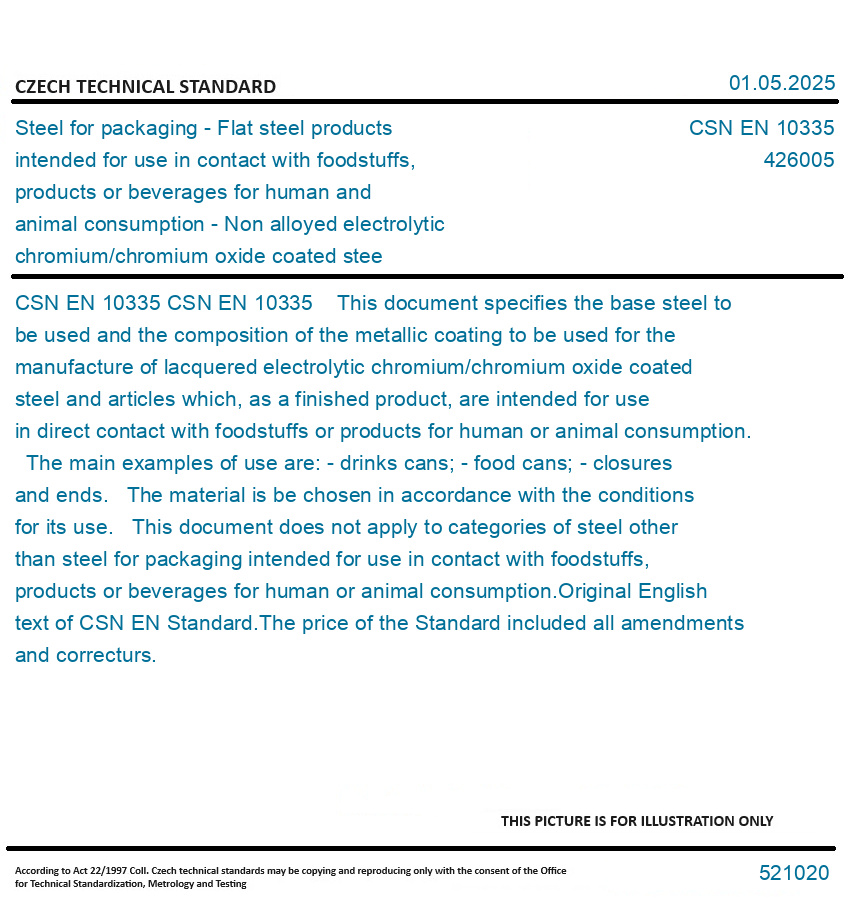 >CSN Standards>42 METALLURGY>4260 Steel for packaging - Flat steel products>CSN EN 10335 - Steel for packaging - Flat steel products intended for use in contact with foodstuffs, products or beverages for human and animal consumption - Non alloyed electrolytic chromium/chromium oxide coated steel