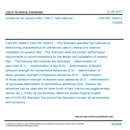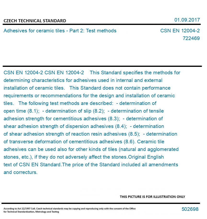 CSN EN 12004-2 This Standard specifies the methods for determining characteristics for adhesives used in internal and external installation of ceramic tiles. This Standard does not contain performance requirements or recommendations for the design and installation of ceramic tiles. The following test methods are described: - determination of open time (8.1); - determination of slip (8.2); - determination of tensile adhesion strength for cementitious adhesives (8.3); - determination of shear adhesion strength of dispersion adhesives (8.4); - determination of shear adhesion strength of reaction resin adhesives (8.5); - determination of transverse deformation of cementitious adhesives (8.6). Ceramic tile adhesives can be used also for other kinds of tiles (natural and agglomerated stones, etc.), if they do not adversely affect the stones. Original English text of CSN EN Standard. The price of the Standard included all amendments and correcturs.