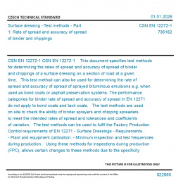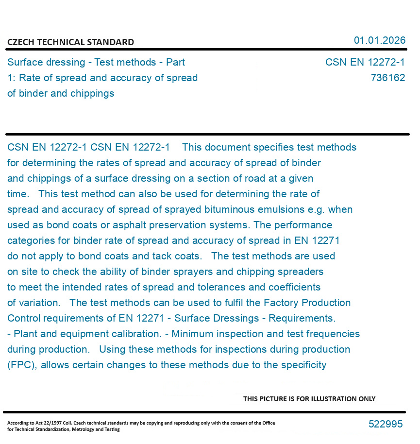 CSN EN 12272-1 This document specifies test methods for determining the rates of spread and accuracy of spread of binder and chippings of a surface dressing on a section of road at a given time. This test method can also be used for determining the rate of spread and accuracy of spread of sprayed bituminous emulsions e.g. when used as bond coats or asphalt preservation systems. The performance categories for binder rate of spread and accuracy of spread in EN 12271 do not apply to bond coats and tack coats. The test methods are used on site to check the ability of binder sprayers and chipping spreaders to meet the intended rates of spread and tolerances and coefficients of variation. The test methods can be used to fulfil the Factory Production Control requirements of EN 12271 - Surface Dressings - Requirements. - Plant and equipment calibration. - Minimum inspection and test frequencies during production. Using these methods for inspections during production (FPC), allows certain changes to these methods due to the specificity of certain sites and materials used (e.g. combined chipping-binder spreaders). In this case, the changes are documented in the Factory Production Control (FPC) and identified in the test reports. Other test methods used to check the rate of spread and accuracy of spread of binder, such as the static spray bar bench test for sprayers, are not covered by this document. WARNING - The use of this document can involve hazardous operations. This document does not purport to address all of the safety problems associated with its use. It is the responsibility of the user of this document to establish appropriate safety practices and determine the applicability of regulatory limitations prior to use.
