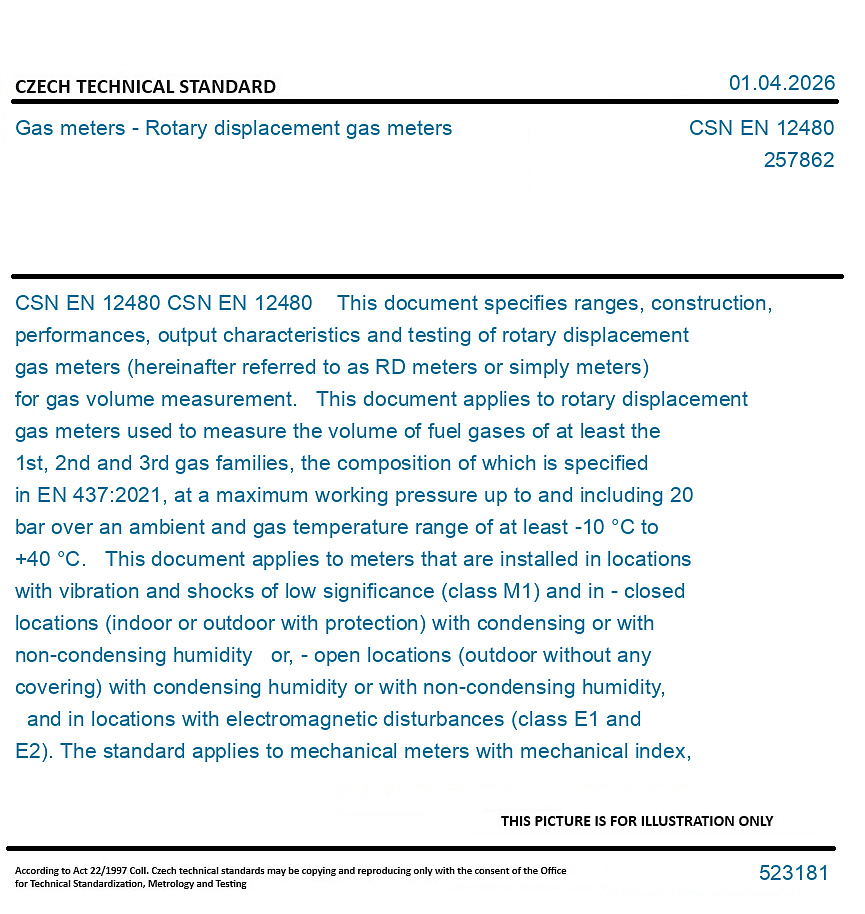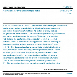 CSN EN 12480 This document specifies ranges, construction, performances, output characteristics and testing of rotary displacement gas meters (hereinafter referred to as RD meters or simply meters) for gas volume measurement. This document applies to rotary displacement gas meters used to measure the volume of fuel gases of at least the 1st, 2nd and 3rd gas families, the composition of which is specified in EN 437:2021, at a maximum working pressure up to and including 20 bar over an ambient and gas temperature range of at least -10 °C to +40 °C. This document applies to meters that are installed in locations with vibration and shocks of low significance (class M1) and in - closed locations (indoor or outdoor with protection) with condensing or with non-condensing humidity or, - open locations (outdoor without any covering) with condensing humidity or with non-condensing humidity, and in locations with electromagnetic disturbances (class E1 and E2). The standard applies to mechanical meters with mechanical index, electronic devices are not covered by this standard. Unless otherwise specified in this standard: - all pressures used are gauge; - all influence quantities, except the one under test, are kept relatively constant at their reference value. This document applies to meters with a maximum allowable pressure PS and the volume V of less than 6 000 bar ˙ L or with a product of PS and DN of less than 3 000 bar. This document is to be used for both pattern approval and individual meter testing. Cross-reference tables are given in: - Annex A for the tests that need to be undertaken for pattern approval; - Annex B for individual meter testing. Some parts of this standard cover meters with mechanical index only. The risk philosophy adopted in this standard is based on the analysis of hazards including pressure. The standard applies principles to eliminate or reduce hazards. Where these hazards cannot be eliminated appropriate protection measures are specified.