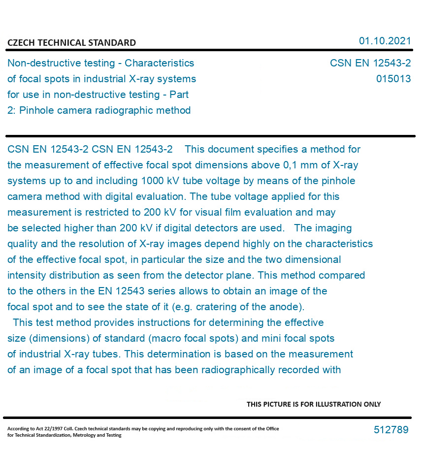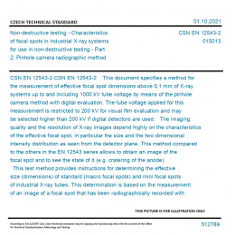 CSN EN 12543-2 This document specifies a method for the measurement of effective focal spot dimensions above 0,1 mm of X-ray systems up to and including 1000 kV tube voltage by means of the pinhole camera method with digital evaluation. The tube voltage applied for this measurement is restricted to 200 kV for visual film evaluation and may be selected higher than 200 kV if digital detectors are used. The imaging quality and the resolution of X-ray images depend highly on the characteristics of the effective focal spot, in particular the size and the two dimensional intensity distribution as seen from the detector plane. This method compared to the others in the EN 12543 series allows to obtain an image of the focal spot and to see the state of it (e.g. cratering of the anode). This test method provides instructions for determining the effective size (dimensions) of standard (macro focal spots) and mini focal spots of industrial X-ray tubes. This determination is based on the measurement of an image of a focal spot that has been radiographically recorded with a "pinhole" technique and evaluated with a digital method. For the characterization of commercial X-ray tube types (i.e. for advertising or trade) it is advised that the specific FS (Focal spot) values of Annex A are used. Original English text of CSN EN Standard. The price of the Standard included all amendments and correcturs.