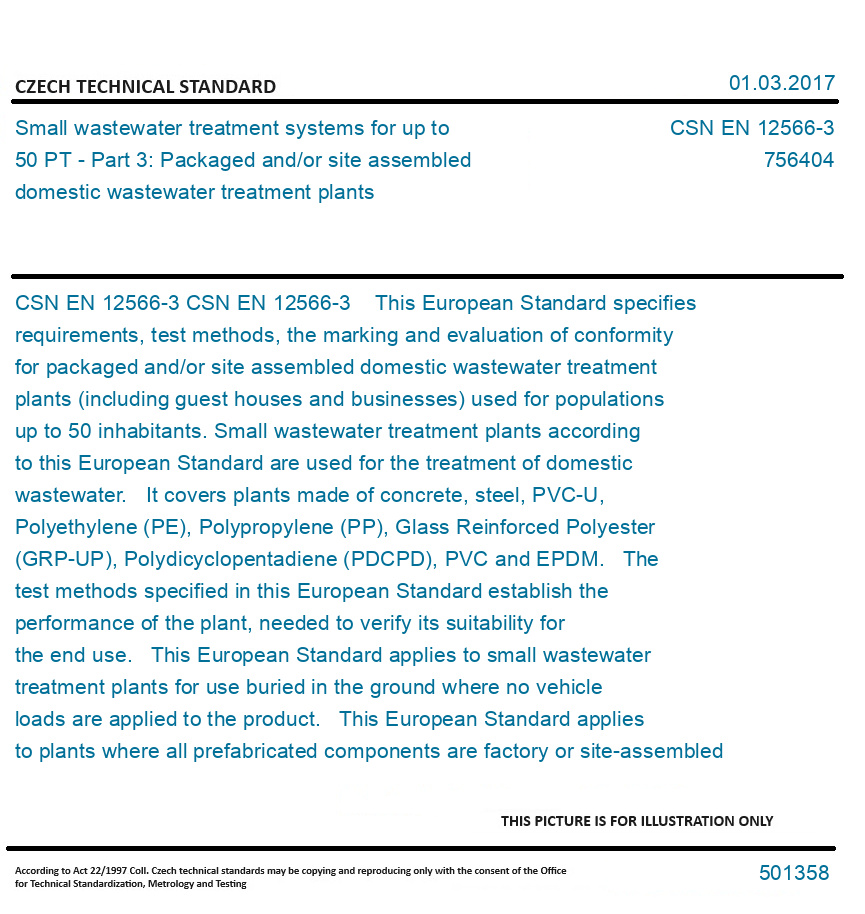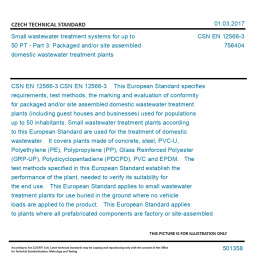 CSN EN 12566-3 This European Standard specifies requirements, test methods, the marking and evaluation of conformity for packaged and/or site assembled domestic wastewater treatment plants (including guest houses and businesses) used for populations up to 50 inhabitants. Small wastewater treatment plants according to this European Standard are used for the treatment of domestic wastewater. It covers plants made of concrete, steel, PVC-U, Polyethylene (PE), Polypropylene (PP), Glass Reinforced Polyester (GRP-UP), Polydicyclopentadiene (PDCPD), PVC and EPDM. The test methods specified in this European Standard establish the performance of the plant, needed to verify its suitability for the end use. This European Standard applies to small wastewater treatment plants for use buried in the ground where no vehicle loads are applied to the product. This European Standard applies to plants where all prefabricated components are factory or site-assembled by one manufacturer and which are tested as a whole. NOTE: In some countries, domestic wastewater treatment plants are followed by other systems to conform to national regulations. Original English text of CSN EN Standard. The price of the Standard included all amendments and correcturs.