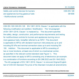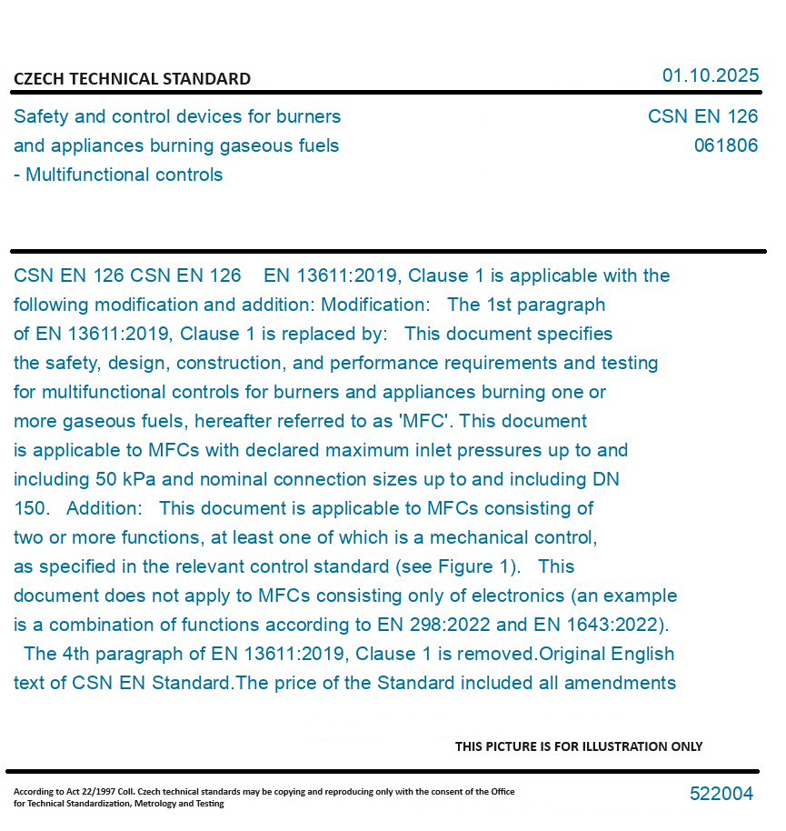 CSN EN 126 EN 13611:2019, Clause 1 is applicable with the following modification and addition: Modification: The 1st paragraph of EN 13611:2019, Clause 1 is replaced by: This document specifies the safety, design, construction, and performance requirements and testing for multifunctional controls for burners and appliances burning one or more gaseous fuels, hereafter referred to as 'MFC'. This document is applicable to MFCs with declared maximum inlet pressures up to and including 50 kPa and nominal connection sizes up to and including DN 150. Addition: This document is applicable to MFCs consisting of two or more functions, at least one of which is a mechanical control, as specified in the relevant control standard (see Figure 1). This document does not apply to MFCs consisting only of electronics (an example is a combination of functions according to EN 298:2022 and EN 1643:2022). The 4th paragraph of EN 13611:2019, Clause 1 is removed. Original English text of CSN EN Standard. The price of the Standard included all amendments and correcturs.