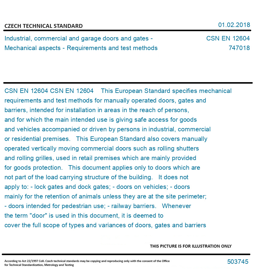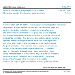 CSN EN 12604 This European Standard specifies mechanical requirements and test methods for manually operated doors, gates and barriers, intended for installation in areas in the reach of persons, and for which the main intended use is giving safe access for goods and vehicles accompanied or driven by persons in industrial, commercial or residential premises. This European Standard also covers manually operated vertically moving commercial doors such as rolling shutters and rolling grilles, used in retail premises which are mainly provided for goods protection. This document applies only to doors which are not part of the load carrying structure of the building. It does not apply to: - lock gates and dock gates; - doors on vehicles; - doors mainly for the retention of animals unless they are at the site perimeter; - doors intended for pedestrian use; - railway barriers. Whenever the term "door" is used in this document, it is deemed to cover the full scope of types and variances of doors, gates and barriers defined by the scope of this European Standard. Original English text of CSN EN Standard. The price of the Standard included all amendments and correcturs.