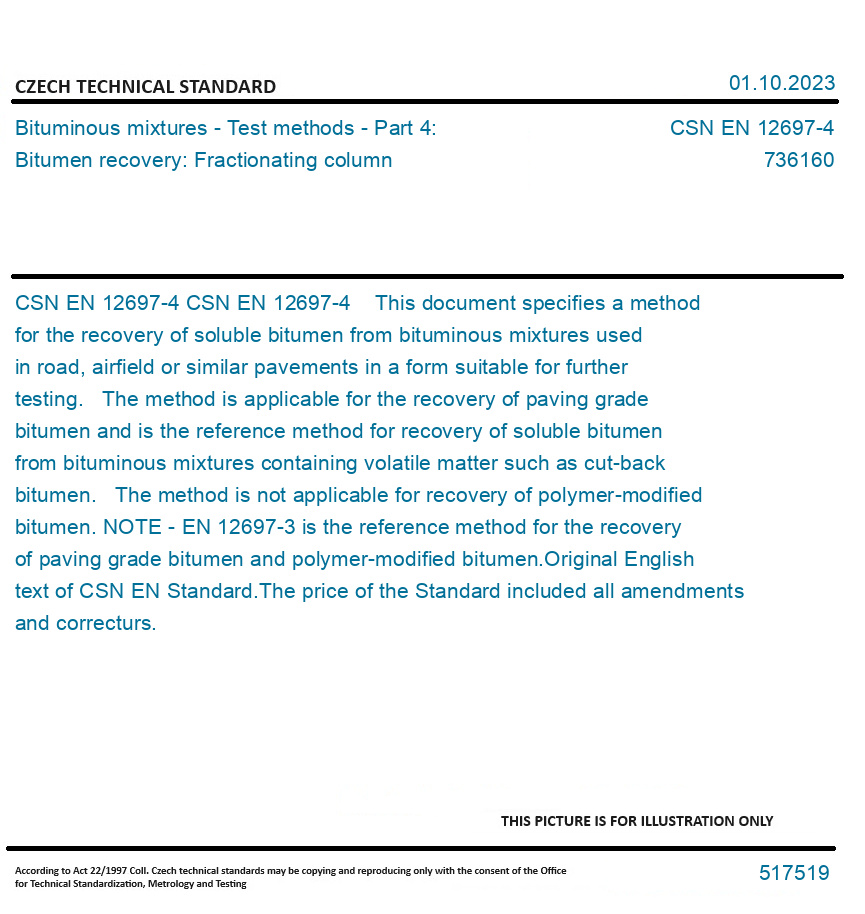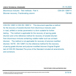 CSN EN 12697-4 This document specifies a method for the recovery of soluble bitumen from bituminous mixtures used in road, airfield or similar pavements in a form suitable for further testing. The method is applicable for the recovery of paving grade bitumen and is the reference method for recovery of soluble bitumen from bituminous mixtures containing volatile matter such as cut-back bitumen. The method is not applicable for recovery of polymer-modified bitumen. NOTE - EN 12697-3 is the reference method for the recovery of paving grade bitumen and polymer-modified bitumen. Original English text of CSN EN Standard. The price of the Standard included all amendments and correcturs.