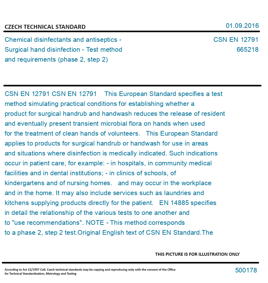 CSN EN 12791 This European Standard specifies a test method simulating practical conditions for establishing whether a product for surgical handrub and handwash reduces the release of resident and eventually present transient microbial flora on hands when used for the treatment of clean hands of volunteers. This European Standard applies to products for surgical handrub or handwash for use in areas and situations where disinfection is medically indicated. Such indications occur in patient care, for example: - in hospitals, in community medical facilities and in dental institutions; - in clinics of schools, of kindergartens and of nursing homes. and may occur in the workplace and in the home. It may also include services such as laundries and kitchens supplying products directly for the patient. EN 14885 specifies in detail the relationship of the various tests to one another and to "use recommendations". NOTE - This method corresponds to a phase 2, step 2 test. Original English text of CSN EN Standard. The price of the Standard included all amendments and correcturs.