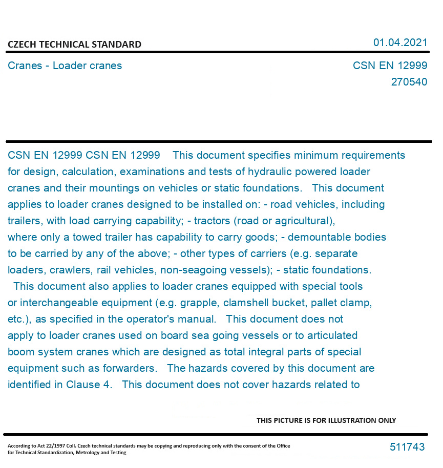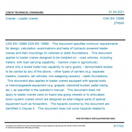 CSN EN 12999 This document specifies minimum requirements for design, calculation, examinations and tests of hydraulic powered loader cranes and their mountings on vehicles or static foundations. This document applies to loader cranes designed to be installed on: - road vehicles, including trailers, with load carrying capability; - tractors (road or agricultural), where only a towed trailer has capability to carry goods; - demountable bodies to be carried by any of the above; - other types of carriers (e.g. separate loaders, crawlers, rail vehicles, non-seagoing vessels); - static foundations. This document also applies to loader cranes equipped with special tools or interchangeable equipment (e.g. grapple, clamshell bucket, pallet clamp, etc.), as specified in the operator's manual. This document does not apply to loader cranes used on board sea going vessels or to articulated boom system cranes which are designed as total integral parts of special equipment such as forwarders. The hazards covered by this document are identified in Clause 4. This document does not cover hazards related to the lifting of persons. NOTE - The use of cranes for lifting of persons can be subject to specific national regulations. This document is not applicable to loader cranes manufactured before the publication of this document. For loader cranes designed before the publication of this document, the provisions concerning stress calculations in the version of EN 12999 that was valid at the time of their design, are still applicable. Original English text of CSN EN Standard. The price of the Standard included all amendments and correcturs.