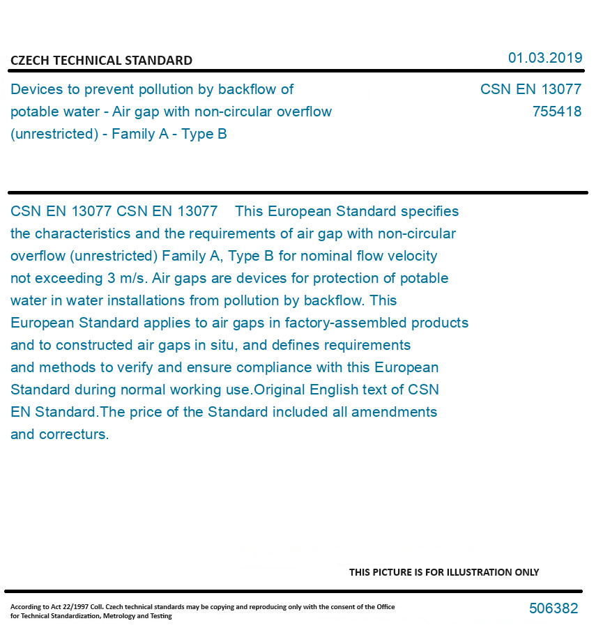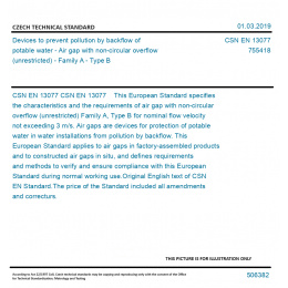 CSN EN 13077 This European Standard specifies the characteristics and the requirements of air gap with non-circular overflow (unrestricted) Family A, Type B for nominal flow velocity not exceeding 3 m/s. Air gaps are devices for protection of potable water in water installations from pollution by backflow. This European Standard applies to air gaps in factory-assembled products and to constructed air gaps in situ, and defines requirements and methods to verify and ensure compliance with this European Standard during normal working use. Original English text of CSN EN Standard. The price of the Standard included all amendments and correcturs.